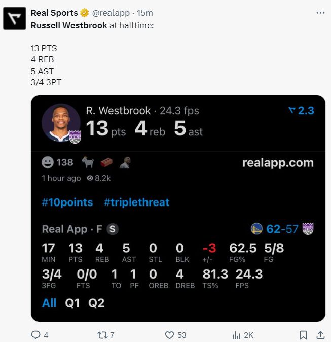 第三節(jié)的威少依舊出色異常,單節(jié)2中2+罰球2中2拿到6分6籃板3助攻。三節(jié)打完19分10籃板8助攻,而且命中率高達70%,他的首次國王三雙就要到來嗎?